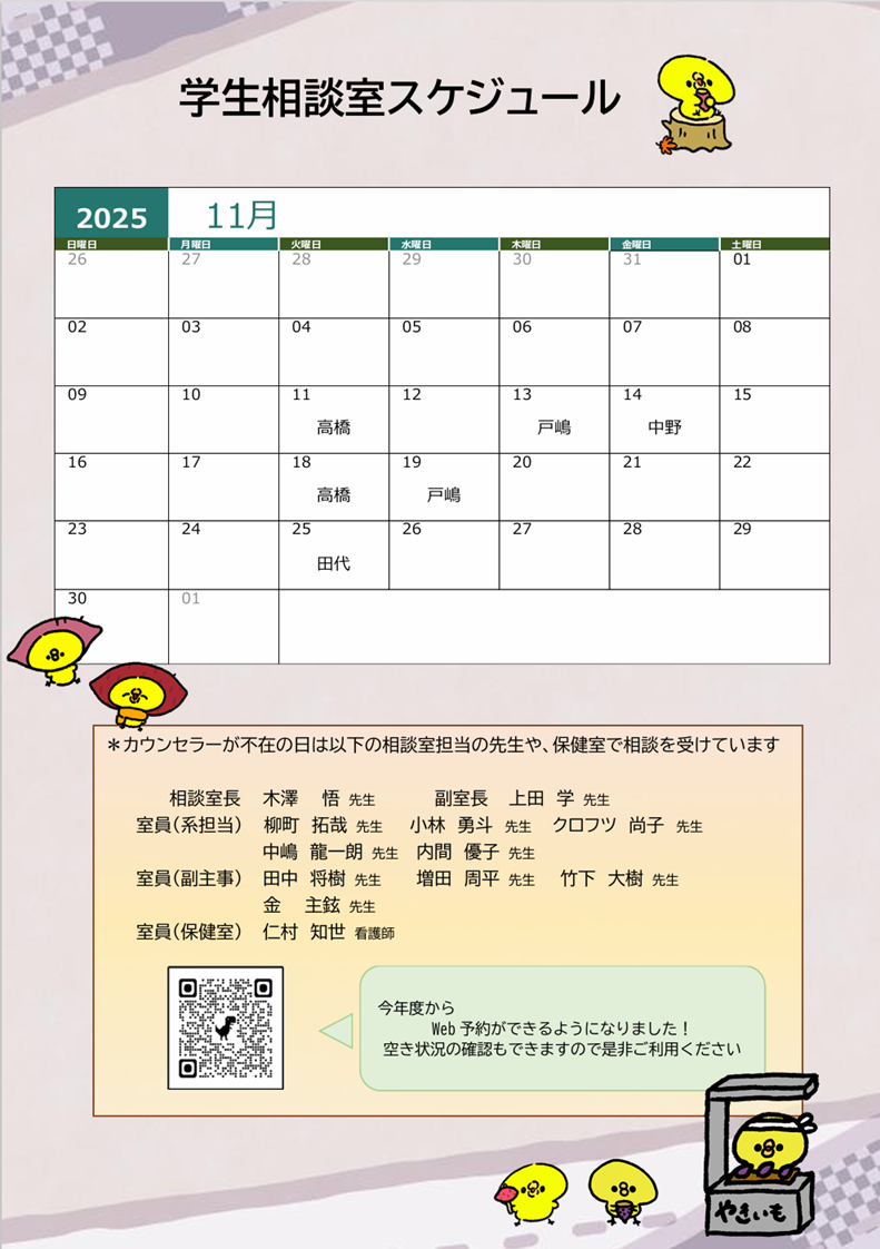 2025/10/26(日)11月のスケジュールについて 開室スケジュール 11月の相談室のスケジュールはこちらです Web予約をする際、 QRコードが読み取れない場合は以下からアクセスをお願いします。 ↓ 学生相談室予約ページ
